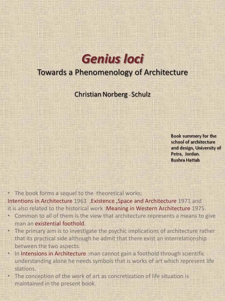 In contemporary usage, it …. In antiquity, the genius loci was often depicted in religious iconography as a figure holding bowls or a snake. Historically this was taken quite literally as the term extends from classical roman religion and the belief that districts of roman had their own protective spirits... Norberg schulz was the first to translate heidegger's ideas on phenomenology in to architecture related intent.